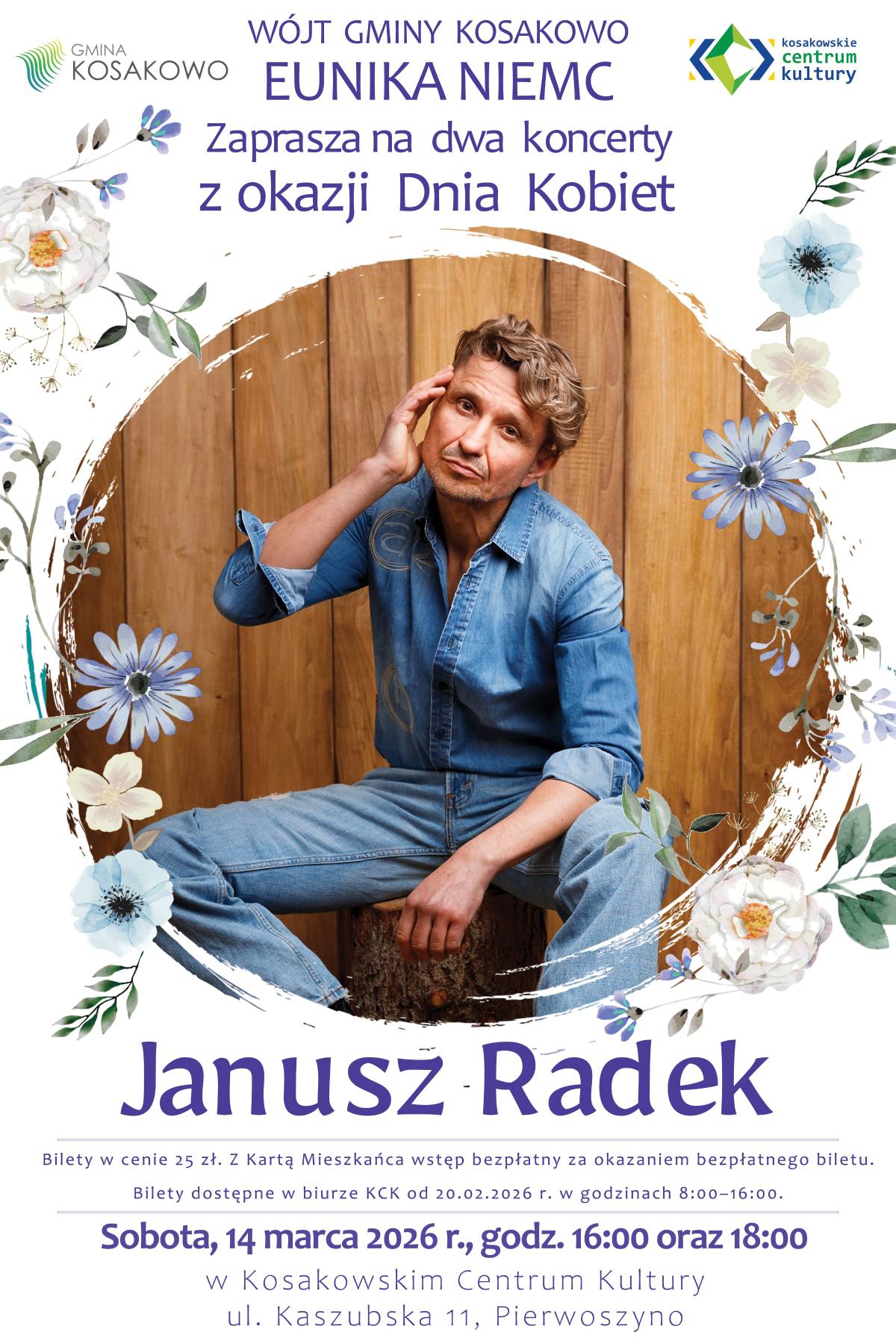 Wójt Gminy Kosakowo Eunika Niemc serdecznie zaprasza na dwa niezwykłe koncerty z okazji Dnia Kobiet, które odbędą się 14 marca 2026 r. w Kosakowskim Centrum Kultury w Pierwoszynie.