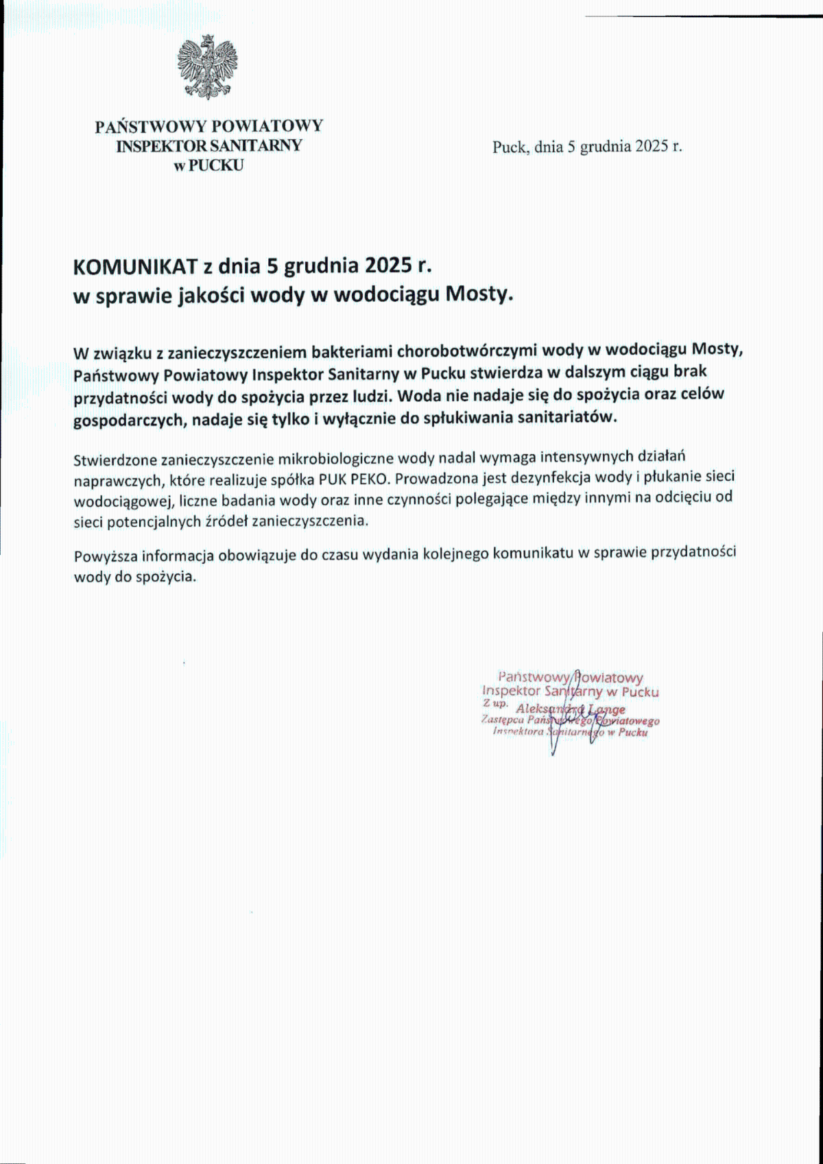 W związku z zanieczyszczeniem bakteriami chorobotwórczymi wody w wodociągu Mosty, Państwowy Powiatowy Inspektor Sanitarny w Pucku stwierdza w dalszym ciągu brak przydatności wody do spożycia przez ludzi.