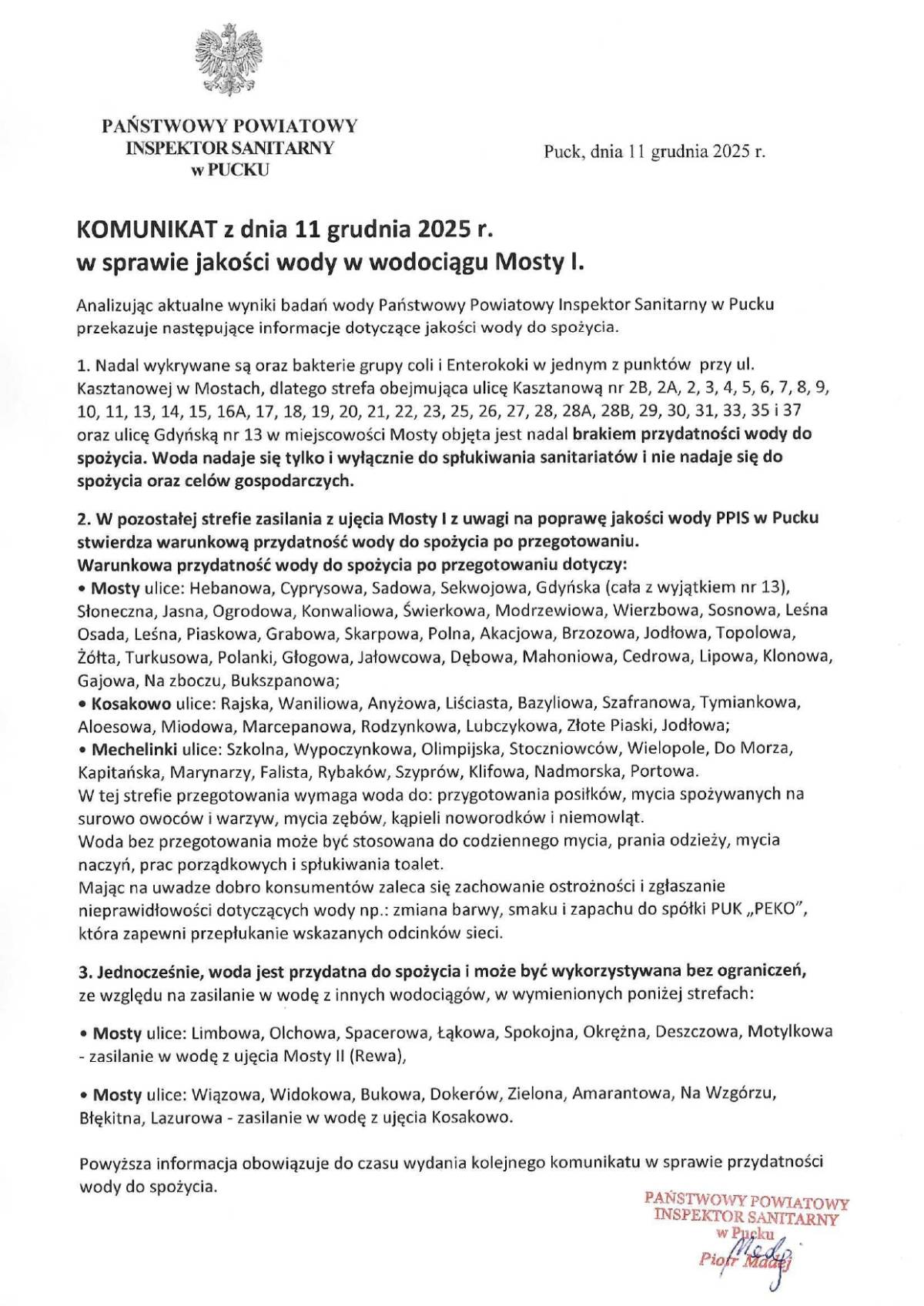 KOMUNIKAT SANEPIDU W PUCKU DOTYCZĄCY WODY Z WODOCIĄGU MOSTY I z dnia 11 grudnia