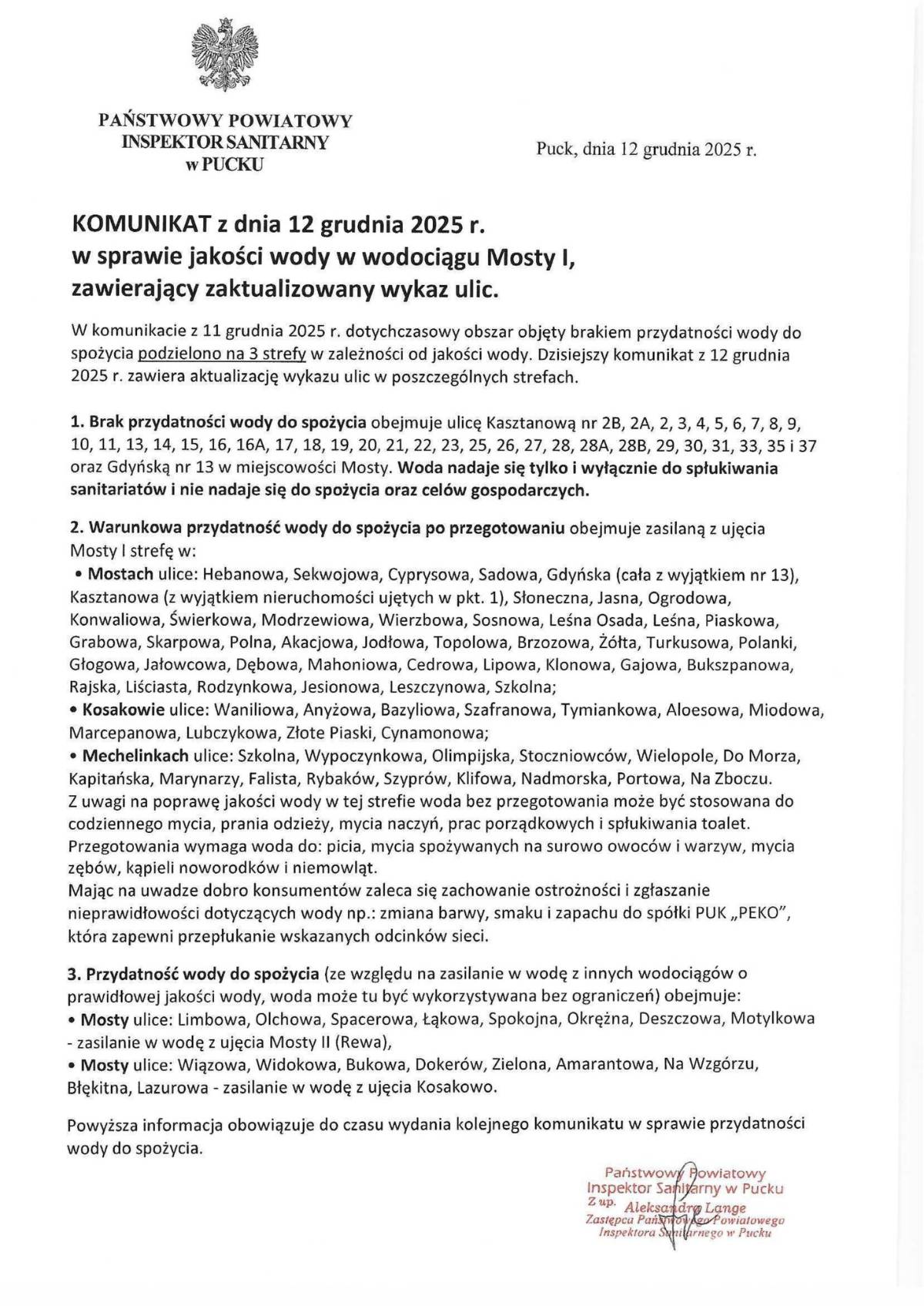 Przedstawiamy komunikat Sanepidu w Pucku z dnia 12 grudnia 2025 r. w sprawie jakości wody w wodociągu Mosty I.